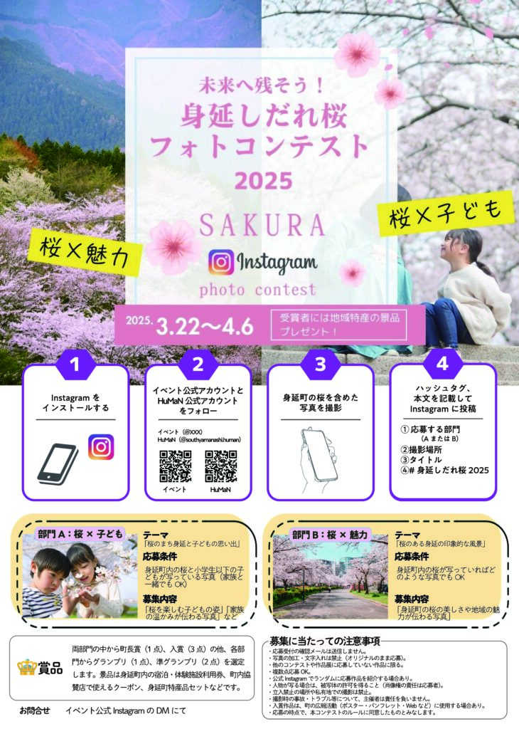 しだれ桜フェス2025のフォトコンテスト、 ついに 応募詳細が公開となりました!🌸 今年は【2部門】で作品を募集! 身延町のしだれ桜とともに、あなたの“とっておきの春の一枚”をぜひご応募ください📷 💡参加はInstagramから簡単投稿♪... -