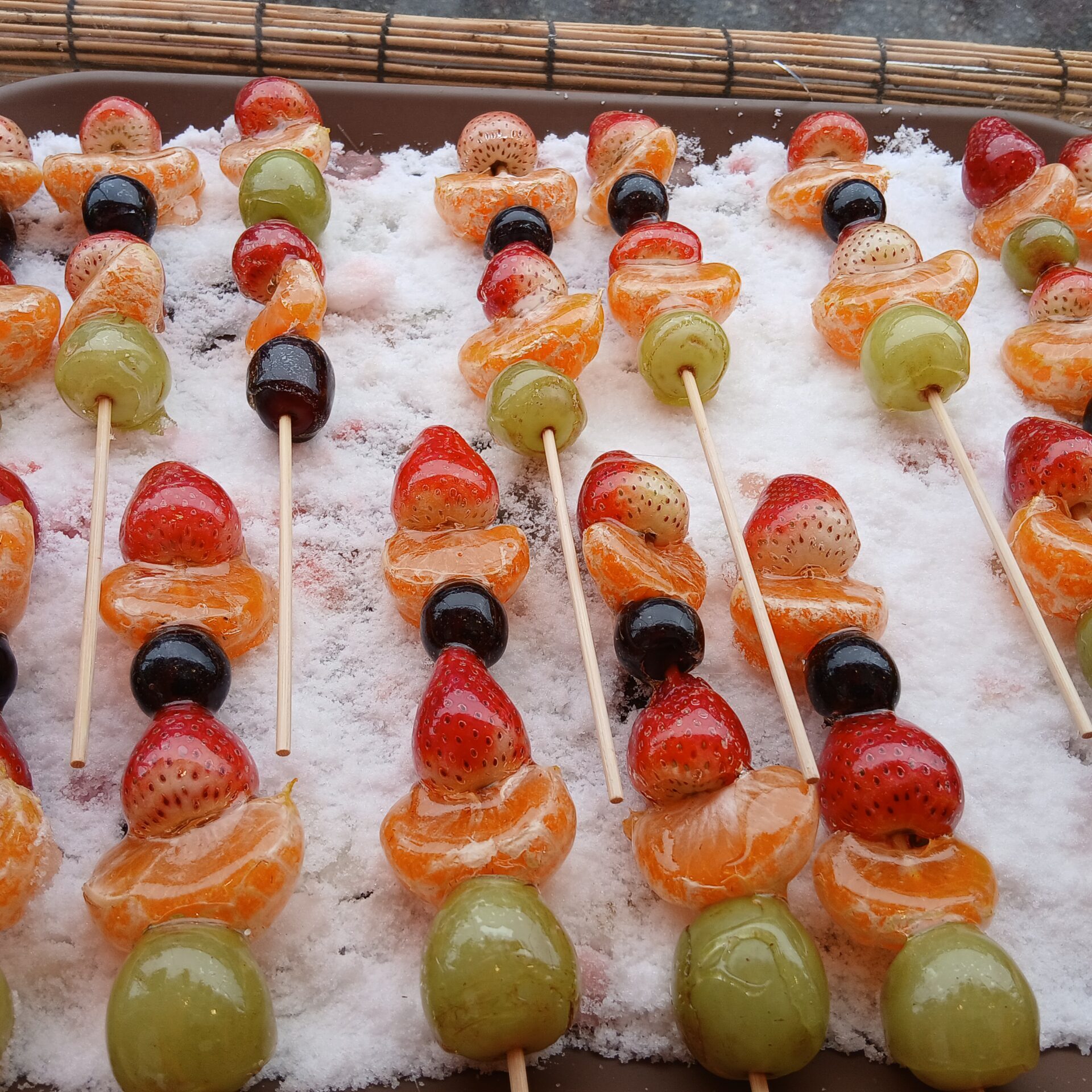 | フルーツ飴は季節のフルーツを使用し飴を薄くコーティングしてパリパリ食感で果汁が溢れてきます。見た目から楽しめる商品です。海鮮串は鉄板にバターで焼きイカゲソ、えび、ホタテ、あわびの4種類です。 | |