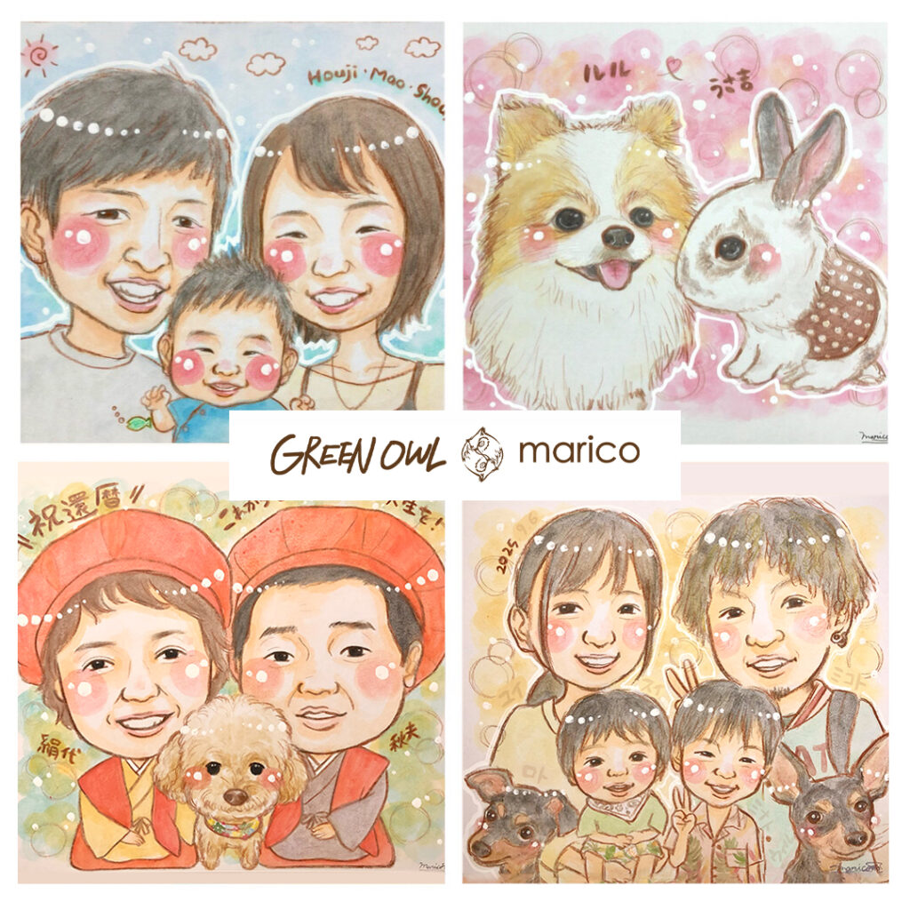 | 水彩色鉛筆で優しい風合いの似顔絵を制作。その場や写真から描き、ペットも対応。後日郵送も可能です。心温まる作品をお届けします。 | |